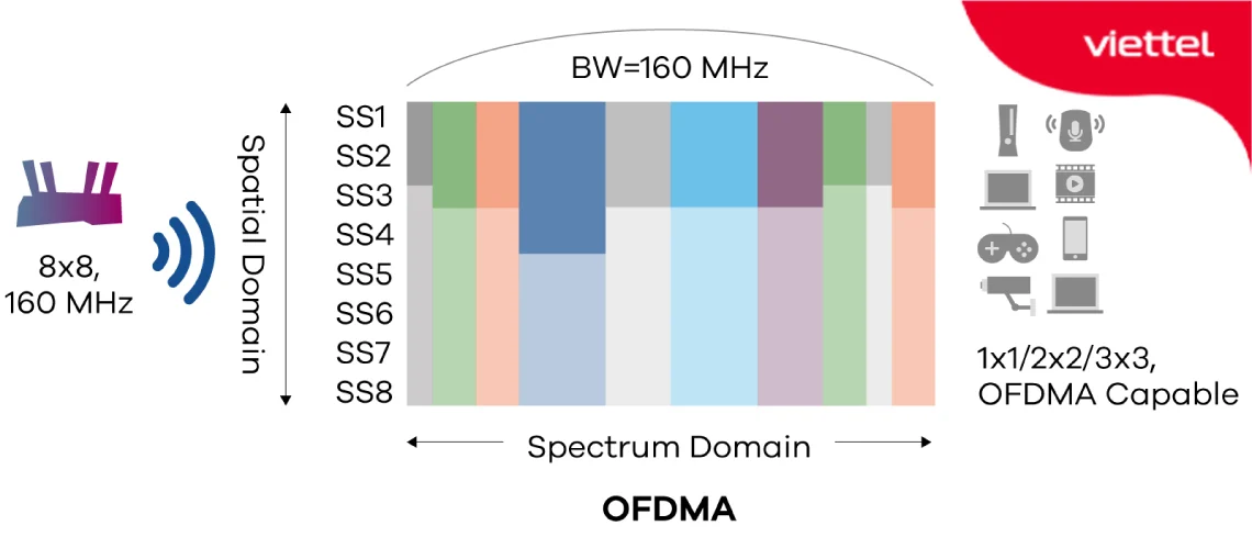 - Công nghệ OFDMA: Chia nhỏ kênh truyền thành kênh con, giúp nhiều thiết bị truy cập đồng thời mà không bị nghẽn.